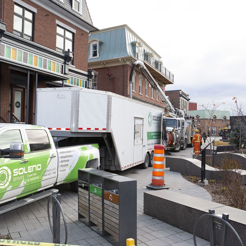 The outdated brick manhole located under Rue de la Gare, a pedestrian shopping street in downtown Victoriaville, was showing signs of deterioration and needed to be replaced. Interested in the many advantages offered by the rehabilitation of underground infrastructure using epoxy spraying, the city’s director of public works selected this manhole to test this solution offered by Soleno Service.